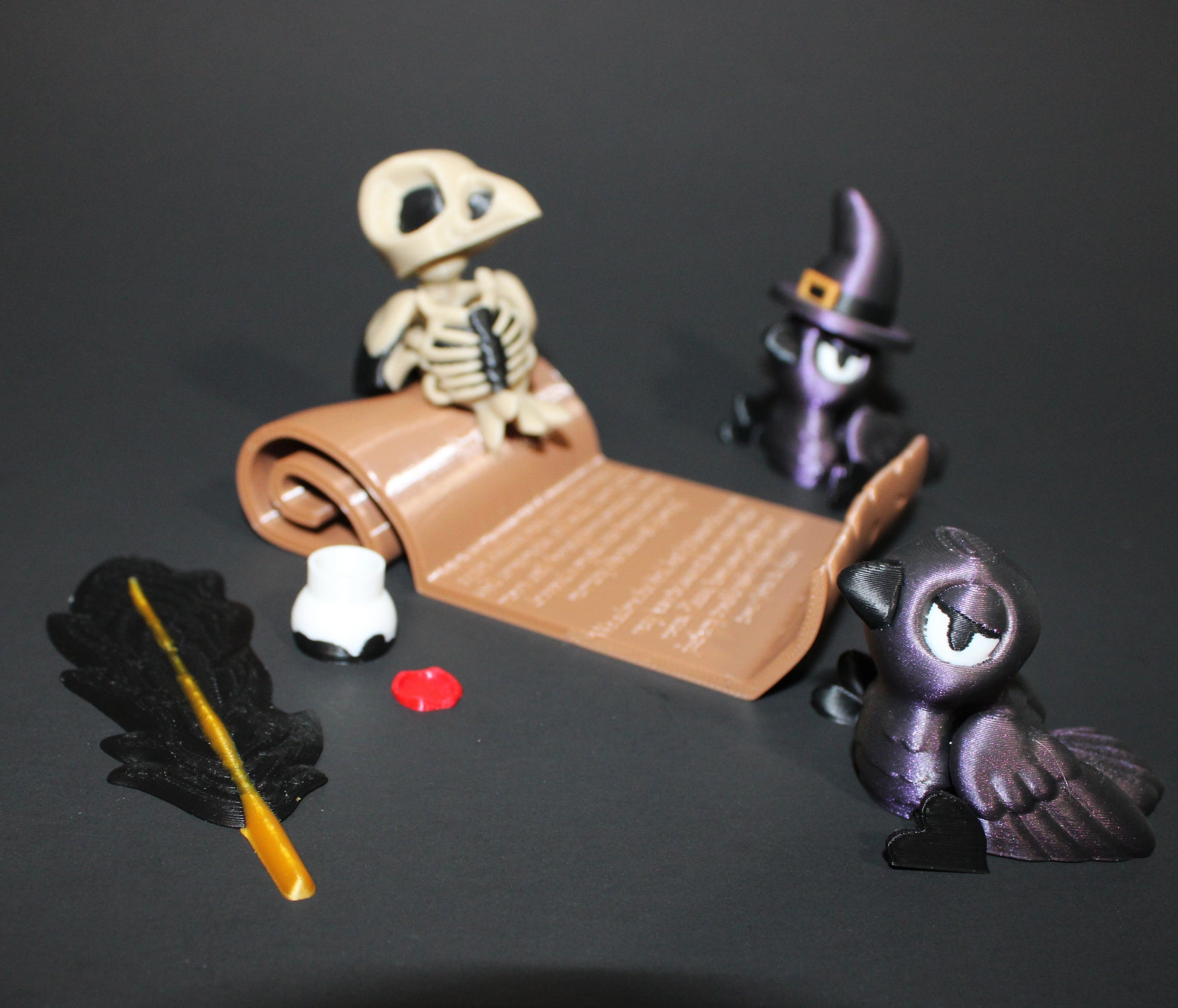 includes crow, crow with hat, bone crow, feather, scroll, ink bottle, and stamp seal