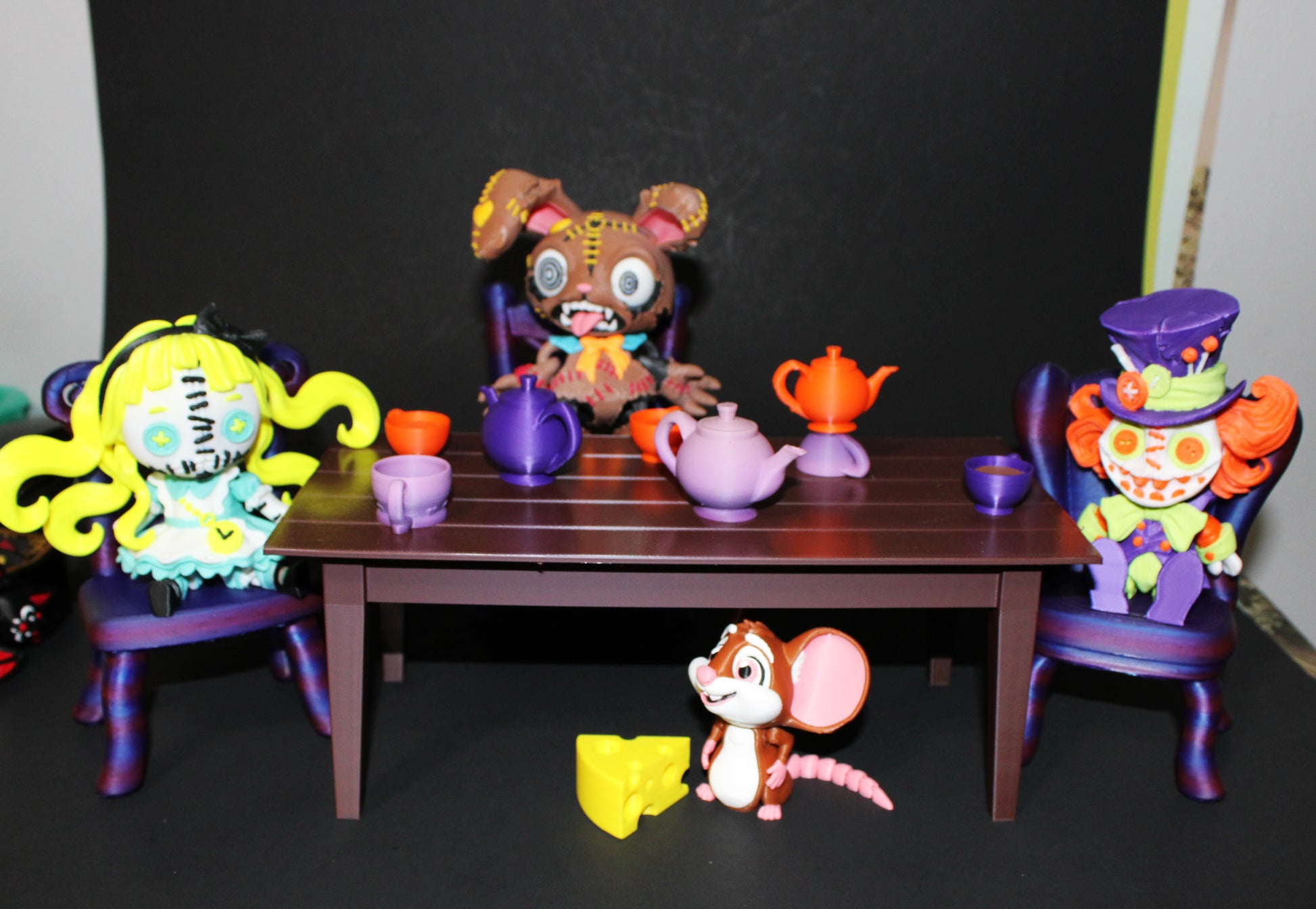 Wonderland Tea Party Fidget Toy Set: Alice, Hatter, March Hare, Door Mouse Includes table and Accessories- 3D Printed